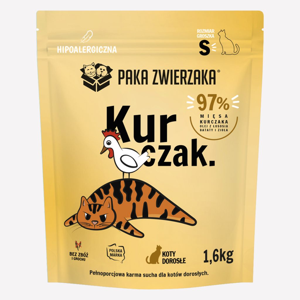 Zadbaj o pełnowartościową, smakowitą dietę swojego kota z suchą karmą PAKA ZWIERZAKA – kurczak. To kompletna, zbilansowana receptura klasy Superpremium, stworzona specjalnie dla dorosłych kotów wszystkich ras – również tych po sterylizacji. Małe granulki w rozmiarze S doskonale sprawdzą się w codziennym karmieniu. Bezzbożowa formuła, wysoka zawartość mięsa i starannie dobrane składniki roślinne sprawiają, że karma spełnia wszystkie potrzeby żywieniowe Twojego pupila – zgodnie z jego naturalnym instynktem mięsożercy.