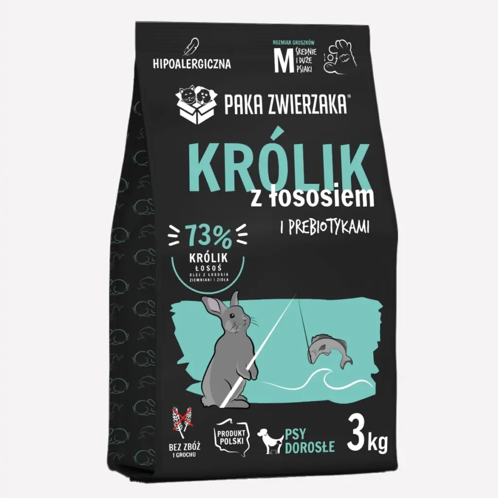 Doskonale zbilansowana karma sucha jakości SUPERPREMIUM pozbawiona zbóż, grochu, kukurydzy, soi, konserwantów i sztucznych barwników. Najwyższej jakości mięso królika, łosoś, warzywa i zioła pozyskiwane od lokalnych dostawców zapewnią wysoką smakowitość i łatwą przyswajalność. Idealna formuła dla psów z delikatnym żołądkiem i nietolerancją na zboża.