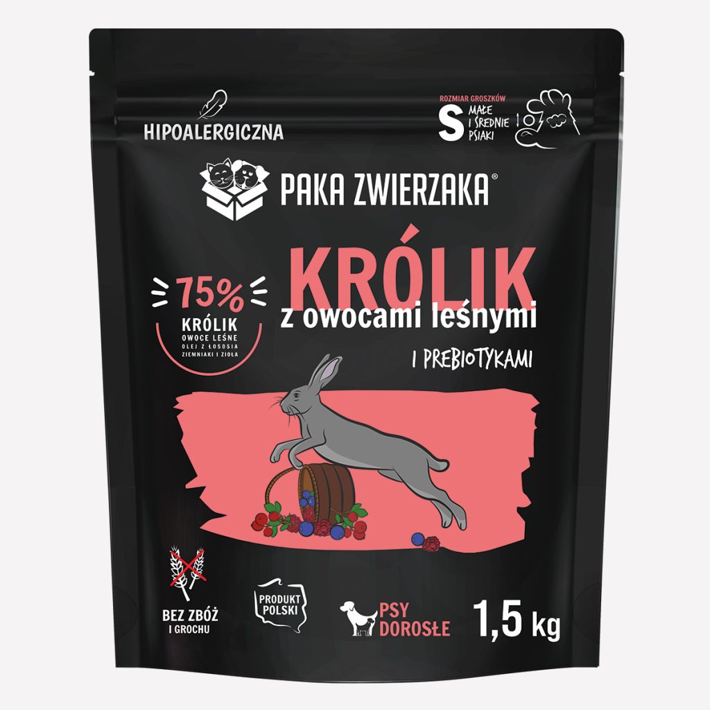 Doskonale zbilansowana karma sucha jakości SUPERPREMIUM pozbawiona zbóż, grochu, kukurydzy, soi, konserwantów i sztucznych barwników. Najwyższej jakości mięso królika, owoce leśne, warzywa i zioła pozyskiwane od lokalnych dostawców zapewnią wysoką smakowitość i łatwą przyswajalność. Idealna formuła dla psów z delikatnym żołądkiem i nietolerancją na zboża.