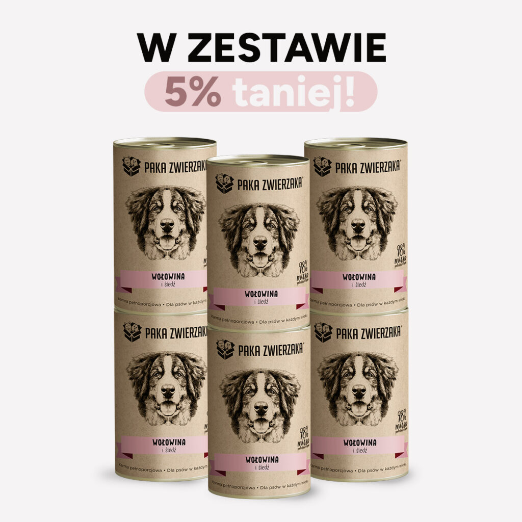 PAKA ZWIERZAKA Wołowina i śledź 6 × 400 g to mokra karma dla psa z wołowiną i śledziem oparta na wysokiej zawartości składników pochodzenia zwierzęcego. Receptura zawiera mięso i podroby wołowe, śledzia oraz rosół wołowy, dzięki czemu posiłek ma wyraźnie mięsny charakter. Zestaw sześciu puszek umożliwia wygodne porcjowanie karmy i jest około 5% tańszy niż zakup pojedynczych opakowań.